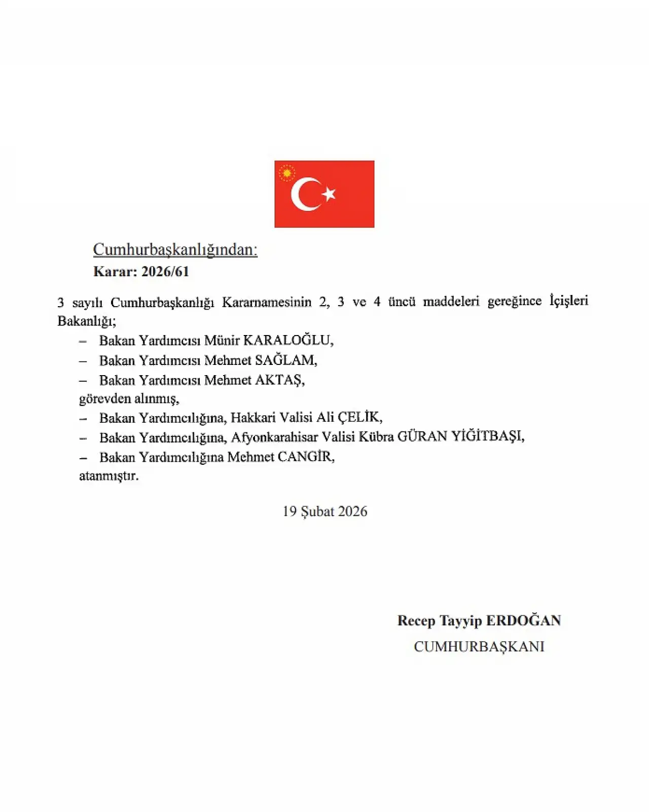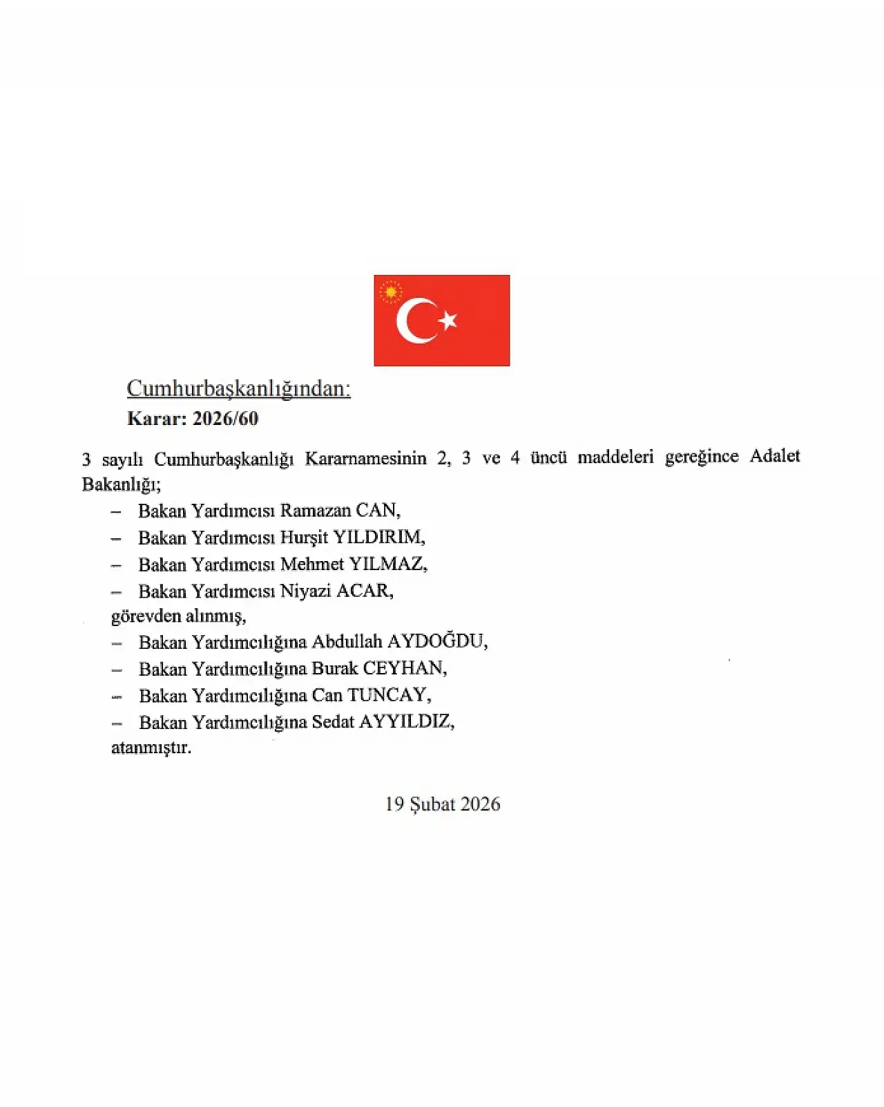 Cumhurbaşkanı Recep Tayyip Erdoğan'ın imzasıyla bugünkü Resmi Gazetede yayımlanan kararnameye göre Adalet Bakanlığı ve İçişleri Bakanlığı Bakan Yardımcıları değişti.