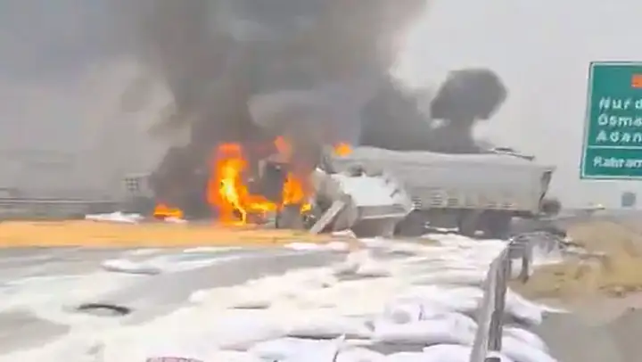TAG Otoyolu'nda 3 tırın karıştığı zincirleme kaza sonrası yangın çıktı. Gaziantep batı gişeleri yakınlarında mısır, un ve gübre yüklü üç tırın çarpışmasıyla alev alan araçlara itfaiye ekipleri müdahale etti.