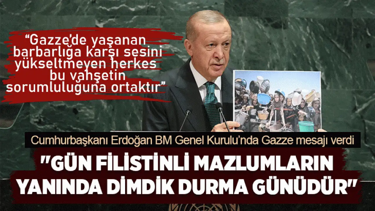 Cumhurbaşkanı Recep Tayyip Erdoğan, Birleşmiş Milletler Genel Kurulu'nda yaptığı konuşmada Gazze'de yaşananlara dikkat çekti. Konuşması sırasında Gazze'de günlük hayatı anlatan bir fotoğraf gösteren Erdoğan, '2025 yılında böyle bir gaddarlığın makul sebebi olabilir mi?' sözleriyle dünya liderlerine seslendi.