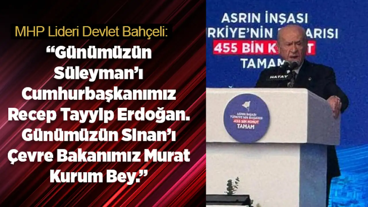 MHP Genel Başkanı Devlet Bahçeli, Hatay'da deprem konutlarının teslim töreninde yaptığı konuşmada, 'MHP Genel Başkanı Devlet Bahçeli: 'Günümüzün Süleyman'ı Recep Tayyip Erdoğan, günümüzün Sinan'ı Murat Kurum'dur.' dedi.