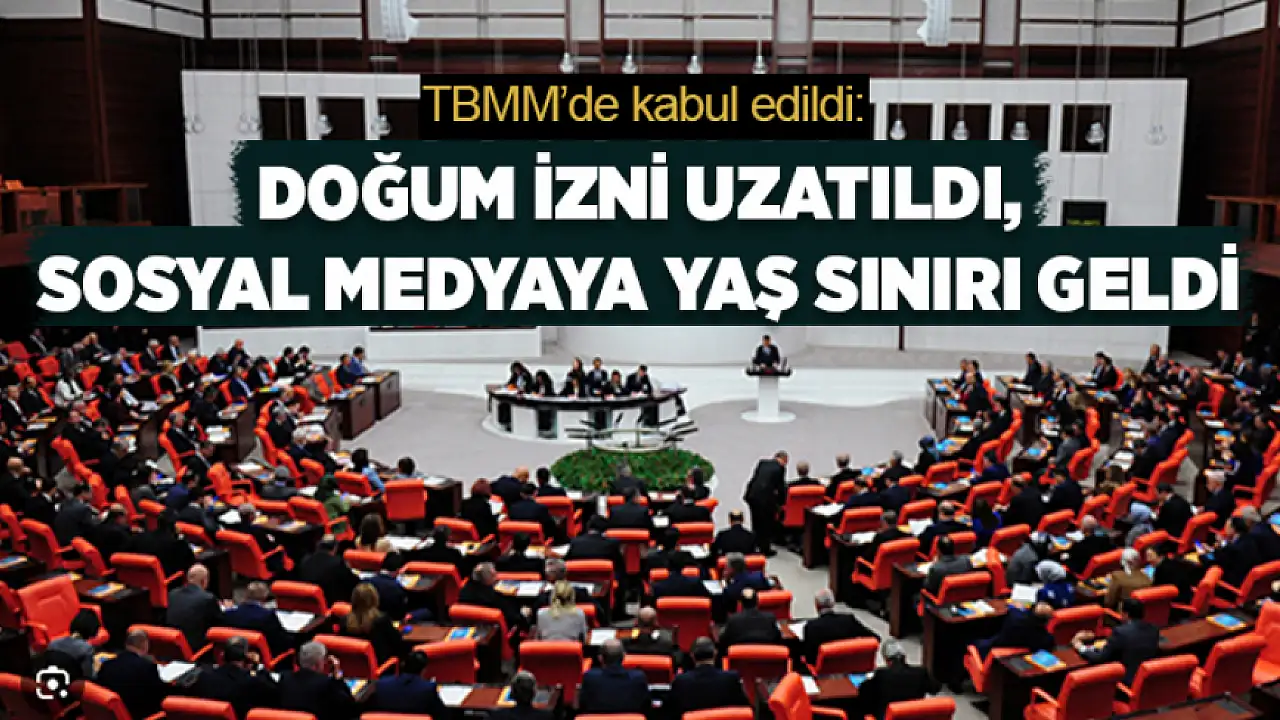 Türkiye Büyük Millet Meclisi Genel Kurulu'nda doğum izni süresinin uzatılmasını ve 15 yaş altı çocukların sosyal medya kullanımına yönelik düzenlemeleri içeren kanun teklifi kabul edilerek yasalaştı.
