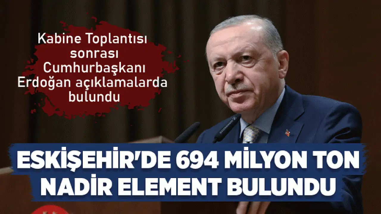 Cumhurbaşkanı Recep Tayyip Erdoğan, Kabine Toplantısı'nın ardından yaptığı açıklamada, Eskişehir'in Beylikova ilçesinde 694 milyon ton nadir toprak elementi kaynağı tespit edildiğini duyurdu. Erdoğan, bu sahanın dünyanın ikinci büyük nadir toprak kaynağı olduğunu belirtti.