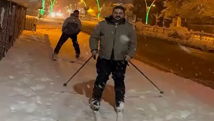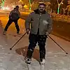 Kar kalınlığının yaklaşık 30 santimetreye ulaştığı kent merkezinde üç arkadaş, kayak ekipmanlarını takarak Muş’un en işlek noktalarından biri olan İstasyon Caddesi’nde kayak yaptı.