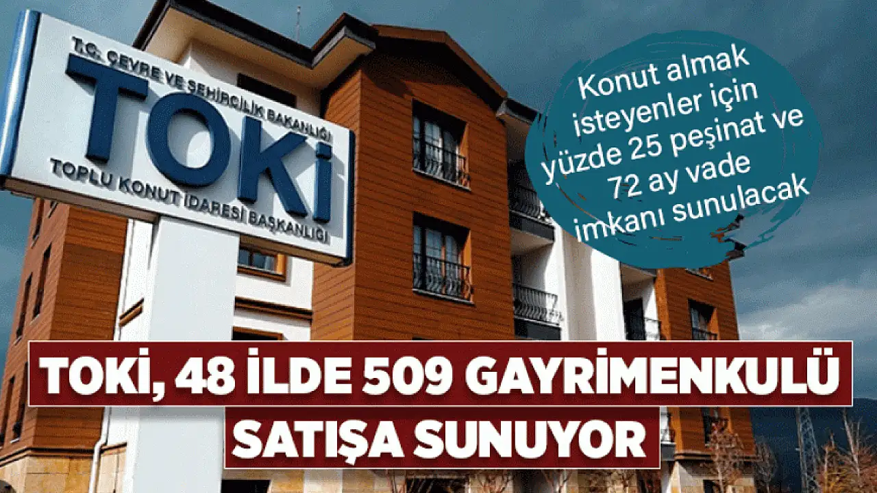 Toplu Konut İdaresi Başkanlığı (TOKİ), Türkiye genelinde 48 ilde yer alan toplam 509 gayrimenkulü açık artırma yöntemiyle satışa çıkarıyor. Satışa sunulan taşınmazlar arasında konut ve iş yerleri bulunuyor.