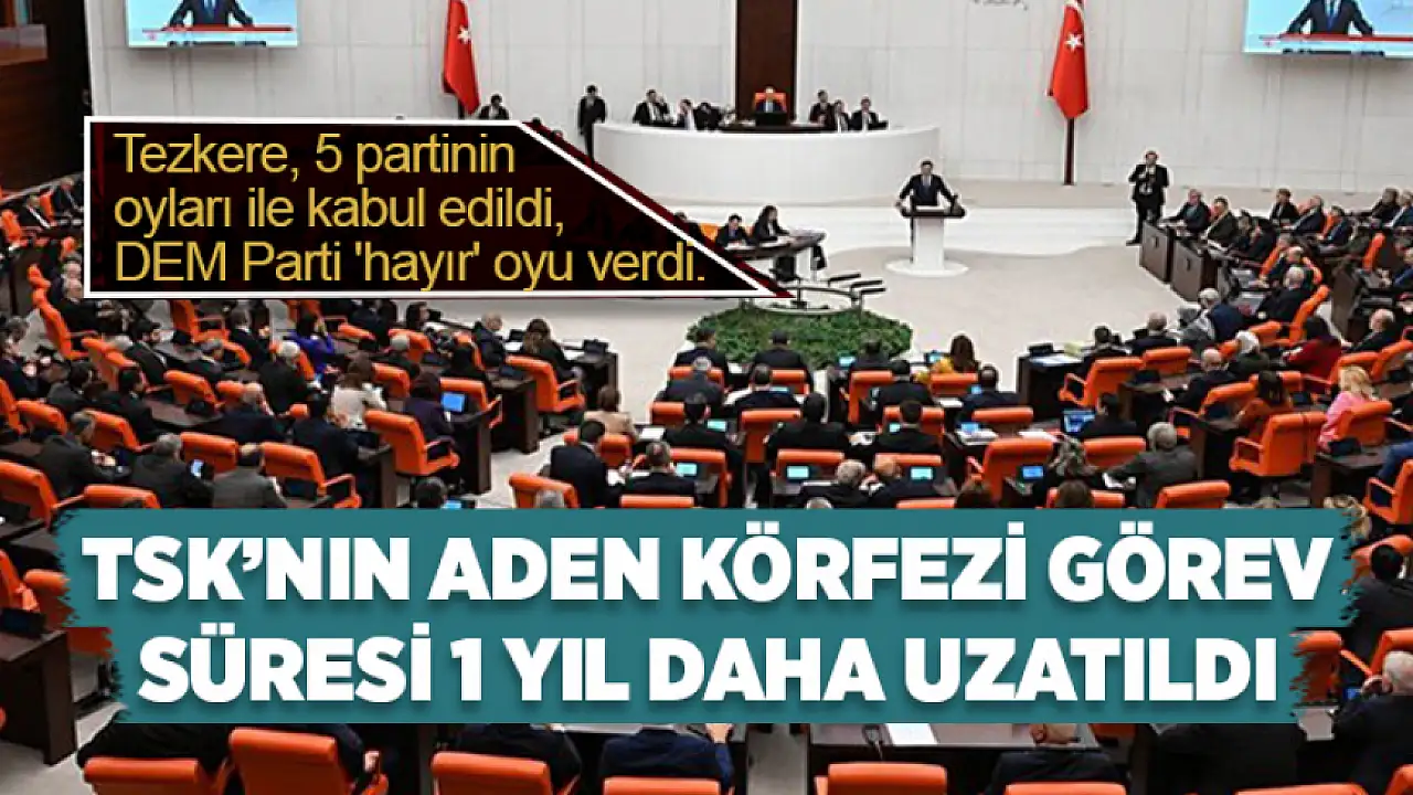 Türk Silahlı Kuvvetleri'nin (TSK) Aden Körfezi, Somali kara suları ve açıkları, Arap Denizi ile çevre bölgelerdeki deniz güvenliği görev süresinin bir yıl uzatılmasına ilişkin Cumhurbaşkanlığı tezkeresi, TBMM Genel Kurulu'nda kabul edildi. Yeni düzenlemeyle TSK deniz unsurlarının bölgedeki görevi 10 Şubat 2027'ye kadar devam edecek.