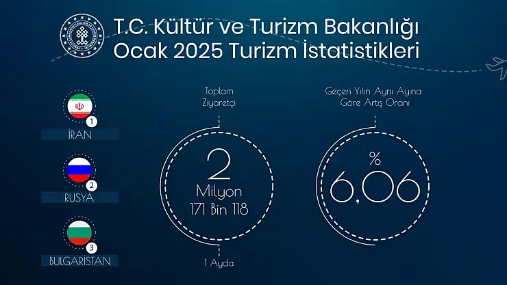 Kültür ve Turizm Bakanlığı’nın açıkladığı verilere göre, Ocak ayında Türkiye’yi ziyaret eden yabancı turist sayısı geçen yılın aynı dönemine kıyasla %6,06 artarak 2 milyon 171 bin 118’e ulaştı. Bu veriler, Türkiye’nin 2025’e turizm açısından güçlü bir başlangıç yaptığını ortaya koyuyor.